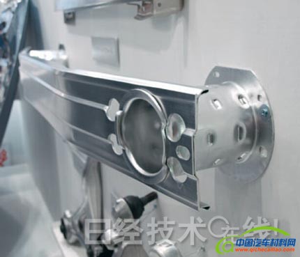| 图18:神户制钢所通过电磁成型工艺制作的保险杠 通过电磁成型工艺使“雷克萨斯GS”的保险杠与保险杠托架实现结合。在铝合金板上打孔,在其中插入铝合金管,并在管子的内侧设置线圈,向线圈内通入大电流,利用排斥力成型。 |