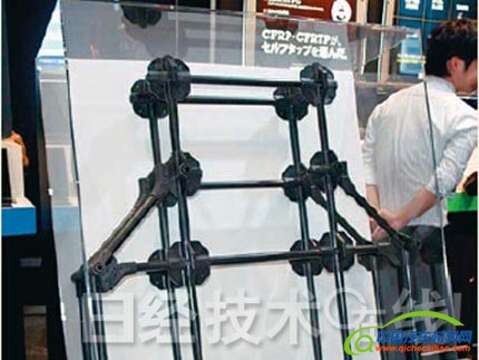 | 图16:CFRP车架的模型 小高精密与东京鋲兼展出。CFRP(碳纤维增强树脂基复合材料)管使用CFRTP(碳纤维强化热可塑性树脂)接头连接。 |