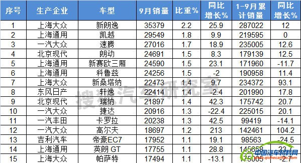据搜狐汽车研究室获得的最新数据显示:2014年9月国内狭义乘用车销量为1,594,713辆,同比增长7.9%。其中轿车销量为1,073,500辆,同比增长0.4%,占狭义乘用车市场份额的67.3%;1-9月轿车累计销量9,066,556辆,同比增长5%,占狭义乘用车市场份额的69%。以下是搜狐汽车研究室整理的9月份国内主要轿车车型销量排名情况: