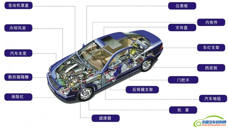 应轻量化大势所趋当前,世界汽车材料技术发展的主要方向是轻量化和环保化。减轻汽车自身的重量是降低汽车排放,提高燃烧效率的最有效措施之一,据悉,汽车的自重每减少10,燃油的消耗可降低6~8.为此,增加塑料在汽车中的应用,便成为降低整车成本及其重量,增加汽车有效载荷的关键。