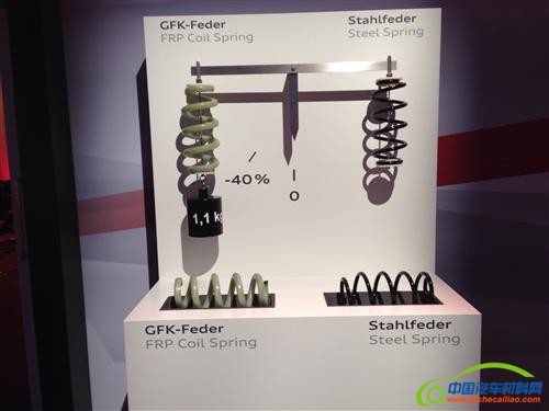 奥迪汽车公司推行的所谓“超级(ultra)”的设计主要集中在最新技术的应用上,其中所采用的技术主要涉及轻量化结构设计和发动机优化设计。玻璃纤维增强型复合材料减震弹簧项目是由奥迪汽车公司和Allevard Rejna公司联合合作完成的。Allevard Rejna公司作为索格菲(Sogefi)集团的一部分,其每年用于研发的费用都占到了公司总收入的3%。索格菲公司表示以上玻璃纤维增强型复合材料减震弹簧已经成功申请专利,而且与普通钢弹簧相比其重量可以节省将近70%。以上玻璃纤维增强型复合材料减震弹簧主要设计用于轿车和轻型商用车中,而且其并不会改变车辆原有的悬架系统结构,同时每辆车还可以因此减重4-6千克(约合8.8磅-13.2磅)。除此之外,以上复合材料减震弹簧的应用还可以大幅降低车辆非弹簧部分的重量。以上全新复合材料减震弹簧所能带来的减重量之所以会有所不同,其主要是由车辆之间的差异性以及车辆减震弹簧设计结构不同所决定的。