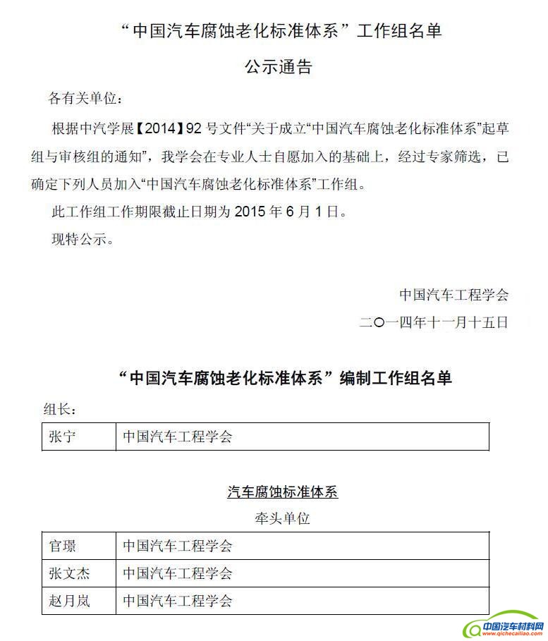 “中国汽车腐蚀老化标准体系”工作组名单公示通告