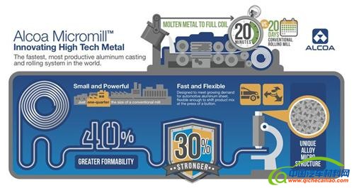 根据美国铝业有限公司的表述,通过利用其此次推出的全新铝合金微轧加工技术可以生产制造出市面上最为优质的铝合金板材。同时,该铝合金微轧加工技术也将会进一步推动新一代汽车铝合金产品的应用。随着各个汽车生产厂商对于汽车铝合金材料的要求变得越来越高,人们对于铝合金的重量要求越来越轻,耐久性越来越强同时可成型特性也要求越来越好,美国铝业公司正是根据以上市场诉求才研发推出了以上全新铝合金微轧加工技术。