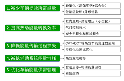 从减少车辆行驶所需阻力、提高热动能量转换效率、减少能量传输过程损失、减少辅助能量消耗、优化车辆能量管理等5个方面,提出应对2020年节能标准的技术选项(见图4)。