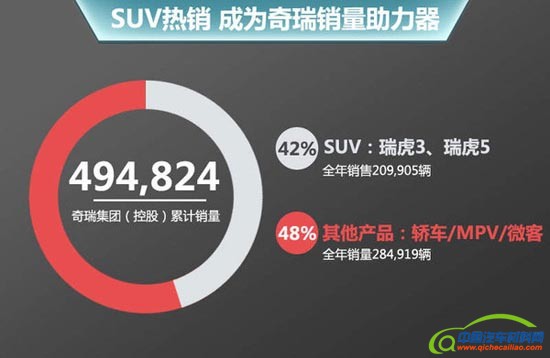 大数据层面能够看出2014年,奇瑞交出了一幅令自己满意的年终成绩单。当然,能够取得这样的销量成绩,无疑离不开出众的产品。在2014年奇瑞在初步整合成艾瑞泽、瑞虎、风云、QQ四大系列的基础上,推出家族系列下的新产品,如瑞虎3、艾瑞泽3等新车。其中依托瑞虎5和瑞虎3两款SUV的热销,全年在SUV车型上销量达到209905辆,同比增长116.6%,国内自主品牌中名列第二,成为去年奇瑞汽车销量增长的关键。