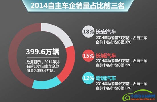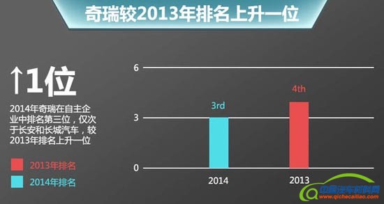 2014年对于奇瑞汽车而言,是战略转型后的第二年,同时也是企业进入实现快速发展的一年。根据奇瑞汽车公布官方数据:2014年奇瑞集团(控股)销量达494,824辆,其中狭义乘用车(不含微面)的销量为460,504辆,在国内自主品牌中销量排名第三名,仅次于长安和长城汽车。相比2013年而言,奇瑞汽车在国内自主品牌销量第四名的位置,提升至2014年的第三位。