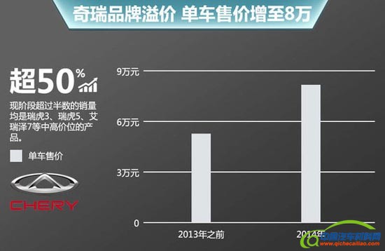 然而销量并不是衡量一家企业的关键,同时也要关注企业的自身实力。在刚刚过去的2014年,奇瑞汽车在经营质量上有着飞跃性的提升。从过去QQ、风云等低价位产品销量占比近8成,现阶段超过半数的销量均是瑞虎3、瑞虎5、艾瑞泽7等中高价位的产品。这样的差别体现在单车售价方面,令奇瑞从过去的5万元提升至8万元,成功实现奇瑞品牌的溢价,脱去了“廉价车”的帽子。