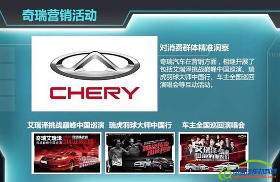 在产品营销方面,除了拥有好的产品和极具性价比的定价外,极具创新性的产品营销推广,成为了2014年奇瑞汽车销量的推进器。据了解,奇瑞汽车相继开展了包括艾瑞泽挑战巅峰中国巡演、瑞虎羽球大师中国行、车主全国巡回演唱会等互动活动,并积极尝试以体育、音乐等为导向的营销方式,令众多用户与奇瑞形成互动,并提升了对品牌的好感度和认可度。