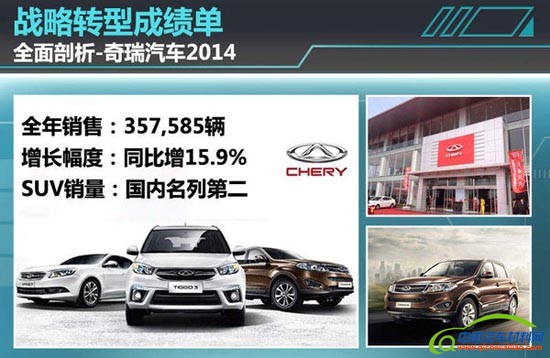 如果仅从奇瑞集团(含奇瑞、开瑞)销量数据上看,企业已经有着明显的提升。奇瑞汽车的品牌方面来看,它的表现无疑更加抢眼。2014年奇瑞在国内销售357,585辆,同比提升15.9%,高于国内乘用车9.89%的增长率,同时更是远高于自主品牌4.1%增长率。