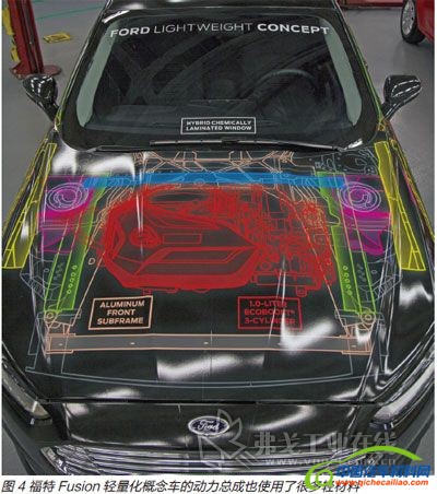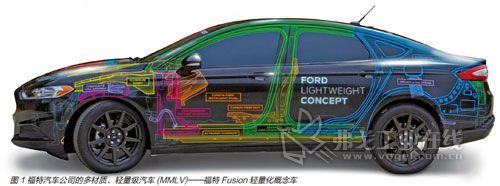 在汽车行业对燃油经济性的要求日益提高、排放标准愈加严格的趋势下,福特汽车公司在2014年夏季最新推出了一款多材质、轻量级汽车——福特Fusion轻量化概念车(见图1),将“轻量化”提升到了全新的高度。