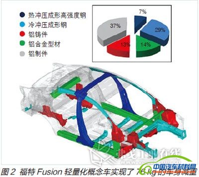 如图2所示,福特Fusion轻量化概念车的主体车身结构部分采用了热冲压成形工艺制造的高强度钢,以保证足够的强度抵抗碰撞冲击,还有一部分采用了高强度的传统冷冲压成形钢,其余约64%的部分使用了不同制造工艺的铝制品,从而使整个车身减重约76kg。