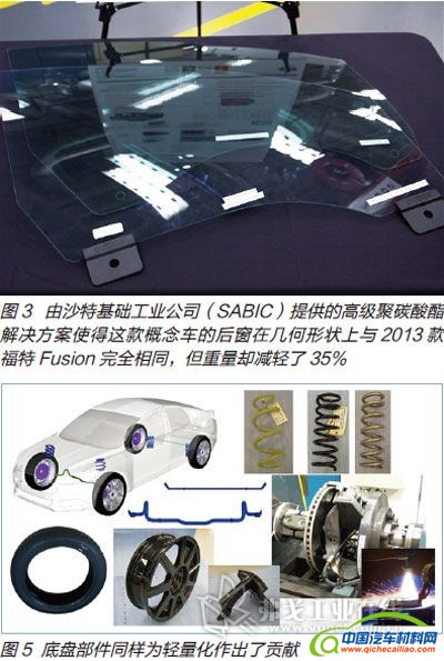 此款概念车的另一大亮点在于后窗所采用的高级聚碳酸酯解决方案(见图3),该方案将LEXAN树脂(一种材质轻便、高透光及抗冲击性能的聚碳酸酯材料)与EXATEC E900等离子涂层(具有耐刮擦与防紫外线性能)相结合。与2013款福特Fusion车型的同款车窗相比,新款车后窗玻璃的厚度虽然增加1mm以上,但质量却总计减轻了约3.36kg——占总重量的35%。