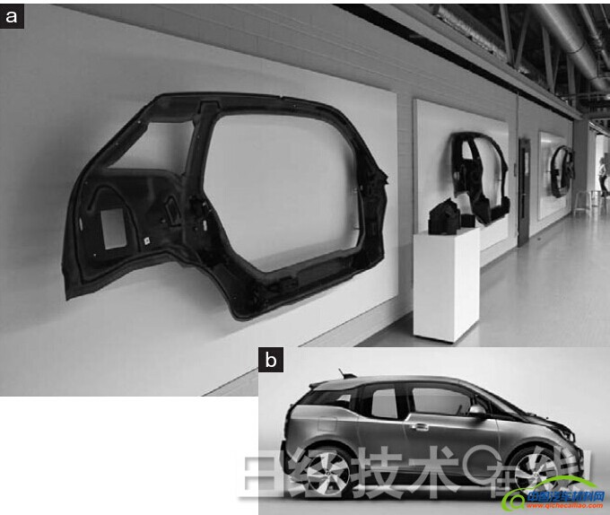i3的上部骨架采用热固性CFRP制造。(a)为主要部件的外观。碳纤维的颜色为黑色。(b)为i3的外观。在日本的价格为499万日元(含税)起,充满电后的续航距离为229km(JC08模式)。