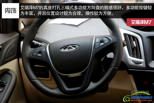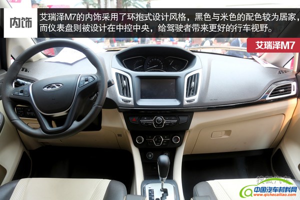 内饰设计上,艾瑞泽M7采用了"T"型环抱式分层中控台设计,并采用了黑色嵌米色搭配。艾瑞泽M7操控台上的功能布局、空调出风口的设计,以及方向盘、排挡的样式,都与艾瑞泽系列家族的设计保持了高度一致。