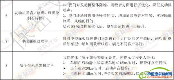 哈弗H8对包括发动调校保守、方向盘操控性轻、制动行程长、车门限位器档位感不清晰、部分功能操作繁琐、发动机噪音、路噪、风噪过大、中控面板纹理单一以及安全带未系报警过早等8个方面进行升级。