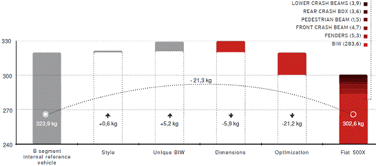 图1给出了Fiat 500X相对于上一代车型的车身轻量化方案