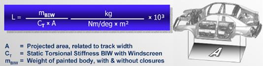 目前行业评价车身轻量化水平的指标主要是车身轻量化系数,车身轻量化系数的计算方法见图2。报告显示,该车身的弯曲刚度为13500N/mm,静态扭转刚度为26950 Nm/°,比上一代产品的扭转刚度提升近38%,如图3所示。车身的轻量化系数为3.02,比上一代产品轻量化系数降低33%,但车身实际重量却仅下降了6.5%。单从车身轻量化系数来看,似乎该车型的轻量化相对于上一代车型进展很大,然而其重量仅仅是降低6.5%。扭转刚度的提升对于汽车的舒适性和安全性都有重要的作用,但是这个刚度数值是否越大越好一直在行业存在争议,也就是说,是否存在性能过剩的问题。如果说扭转刚度20000Nm/°就足以满足一般操控性和NVH等性能的要求,那是否可以牺牲一定的扭转刚度而换取更多的减重空间的确是个值得讨论的问题。