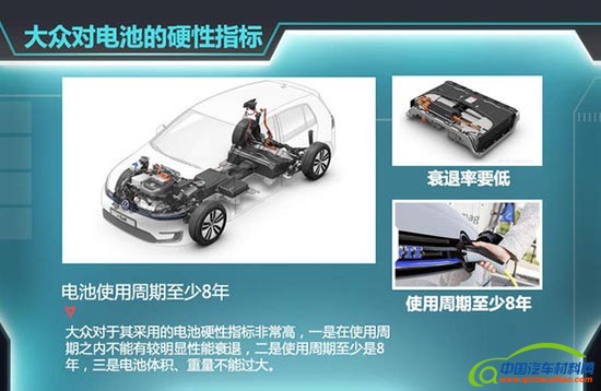 大众对于新能源车所采用电池一直有很高的标准,首先对电池的尺寸和重量都有着严格的约束性。其次,在电池的使用周期中不能有较为明显的衰退,并且即使电池在高温条件下也要达到八年不换电池。这是大众选择电池的硬性指标,除此之外,大众才会考虑成本因素。