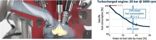 这项技术因为降低了爆震的风险,所以压缩比能够进一步提高,对于改善低载荷油耗也是有利的。水雾喷射还能用来提高扭矩。这是因为额外的冷却效果使得更大的进气量和供油量成为可能。