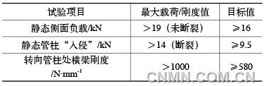 根据产品性能要求,需在三个状态下对仪表板横梁零件性能进行测试,分别是静态管柱“入侵”、静态侧面负载和转向管柱处横梁刚度三项台架试验。