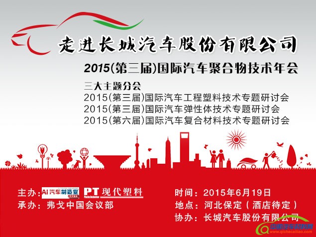 2015(第三届)国际汽车聚合物技术年会将走进中国最大的民营汽车制造企业——长城汽车股份有限公司,并仍将以三大主题分会,即:2015(第三届)国际汽车工程塑料技术专题研讨会、2015(第三届)国际汽车弹性体技术专题研讨会和2015(第六届)国际汽车复合材料技术专题研讨会,为整车、零部件企业以及材料和加工技术供应商提供高水平、高效率的学习、交流平台。