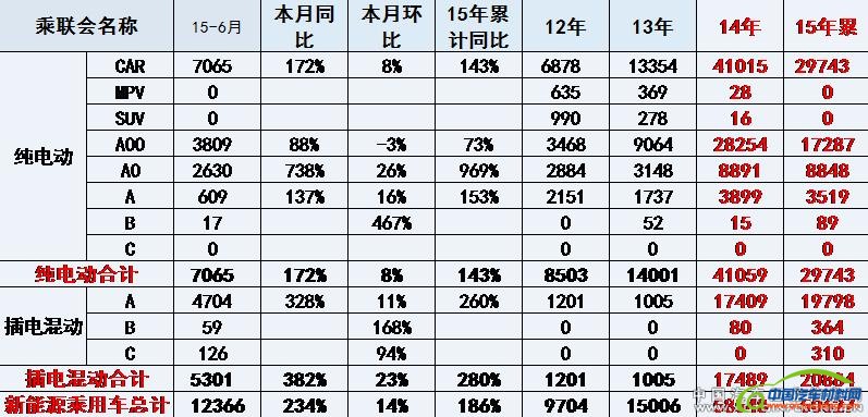 据全国乘用车市场信息联席会统计,2015年6月的我国新能源乘用车销量12366台,其中插电混合动力占比43%,达到5301台,纯电动车占比57%,达到7065台。