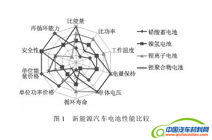 蓄电池在纯电动汽车中是驱动系统唯一动力源,主要有镍镉、镍氢和锂离子电池等。目前,锂离子电池处于高速发展阶段,在诸如日产Leaf、丰田普锐斯plug-in、特斯拉Model S、通用Volt、福特Focus EV以及宝马i3等新能源汽车上都采用锂离子电池。此外,锂资源较为丰富,价格也不贵,可以说锂离子电池是蓄电池中目前最被市场看好的动力电池。4类蓄电池的性能比较见图1。