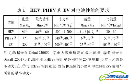 由于不同类型新能源汽车中,车用动力电池的使用方式有较大区别,因此对于其性能要求有较大区别。HEV有汽油发动机作为动力来源,更强调加速性能和爬坡能力,因此更注重电池的比功率(要求高达800一1200 W/kg);PHEV和EV完全以电池作为动力,更强调充电后的续驶能力,因而更关注电池的比能量(要求达到100一160Wh/kg)(见表1)。