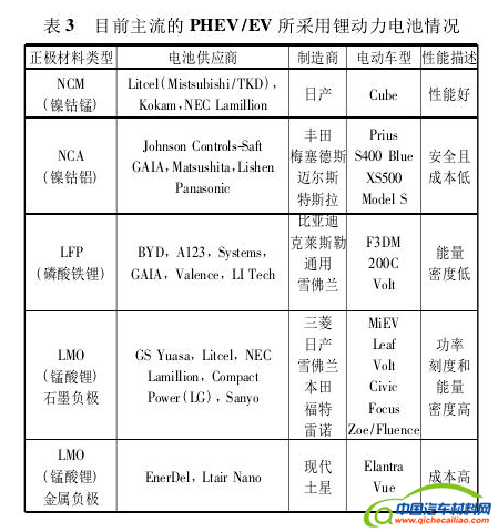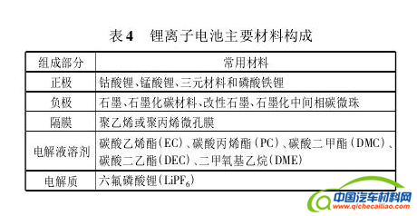 锂离子动力电池主要由正极材料、负极材料、电解液和电池隔膜4部分组成(见表4)。
