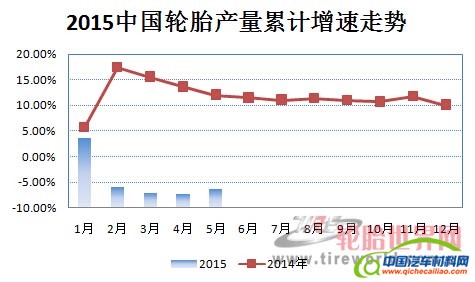 按国家统计局的统计口径,2015年1-6月,中国轮胎产量为4.55亿条,同比下降3.9%。下图为中国橡胶工业协会轮胎分会公布的1-5月份轮胎主要指标增幅对比情况,从图中可以看出,1-5月份,轮胎产量累计增速较2014年同期出现大幅下降。