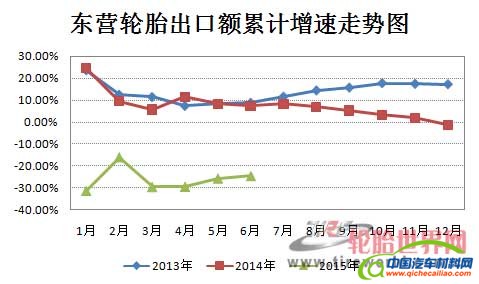 另外,在轮胎工厂聚集地山东省东营市,今年1-6月份,其橡胶轮胎出口额为13.39亿美元,同比下降24.6%。 下图为东营市2013年以来轮胎出口额累计增速走势图,从图中数据可以看出,该市今年上半年轮胎出口遭遇严重挫折。