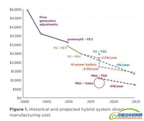 在这篇科技论文中,以丰田普锐斯为例诠释了混合动力车型的变化,并分析了长久以来的车型制造量曲线,以及具有统治性的销售量趋势。如果丰田汽车公司能够持续对接下来的几代普锐斯进行相同大幅度升级改造,或者新类型的混合动力系统在工程研发初期能够保证较高的优化幅度,功能齐备的混合动力系统成本将很有希望在十年内降低50%。另外这种预期推断甚至还没有考虑未来混合动力系统尺寸减小,以及汽车轻量化带来的成本降低。举例来说,汽车混合动力系统的重量降低10%,制造成本可以减小5%左右。