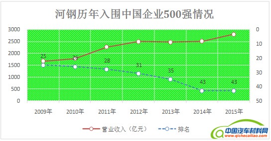 河北钢铁集团于2008年6月成立,2009年入围中国企业500强排名25位,营业收入是1670亿元,到2015年排名为43位,与上年度持平。营业收入上升到2806亿元,增加了296亿元,提高11.8%。河北钢铁集团连续六年进入世界500强企业行列,其钢产量在全国已五年排名第一。