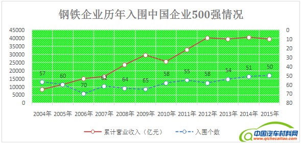 入围中国企业500强的钢铁企业从2004年开始到2015年分别为50家、57家、60家、70家、62家、64家、65家、58家、55家、58家、54家、51家;入围中国制造业企业500强的钢铁企业从2005年开始到2015年分别为77家、85家、91家、98家、88家、88家、84家、81家、80家、81家、72家。