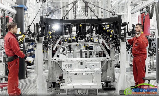 随后是车体框架的座舱和顶部加工。在作业单元中,五轴机器人会在框架上精准地切割出铆点,为之后安装碳纤维复合材料零件、悬架和转向系统做准备。这些铆点的误差只有百分之几毫米。铆点切割完成后,内联极光测量仪会检测ASF车体框架的立体精度。在夹具装配作业单元,技师会使用精确夹具将铝制的车门、引擎盖、挡泥板和辅助零件安装到框架上。