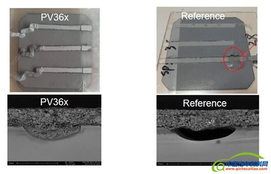 Solamet® PV36x铝浆是整个金属化方案中最早推出的产品。上面两幅图展示了Solamet® PV36x和EVA之间非常强的拉脱力,满足客户在各种测试条件下对于拉力的需求。下面两幅图展示了Solamet® PV36x铝浆对于背部空洞的有效控制,配合Solamet® PV76x正银的低温烧结工艺,可以进一步改善。