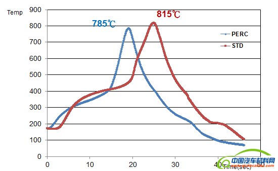 从下方某客户在使用Solamet® PV76x浆料时的实际烧结曲线也显示出Solamet® PV76x相对于常规正银可以在低30-40℃的温度下进行烧结。在较低的烧结温度下对于更低表面浓度和上到110Ohm的方阻上都有着良好的接触,扩散匹配窗口很宽。