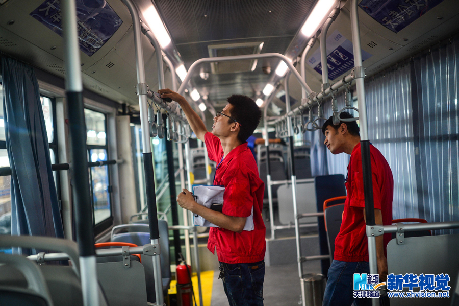 7月31日,在总装车间,一名检测人员正在检测刚刚组装完毕的"金马"牌纯电动公交车。(完)