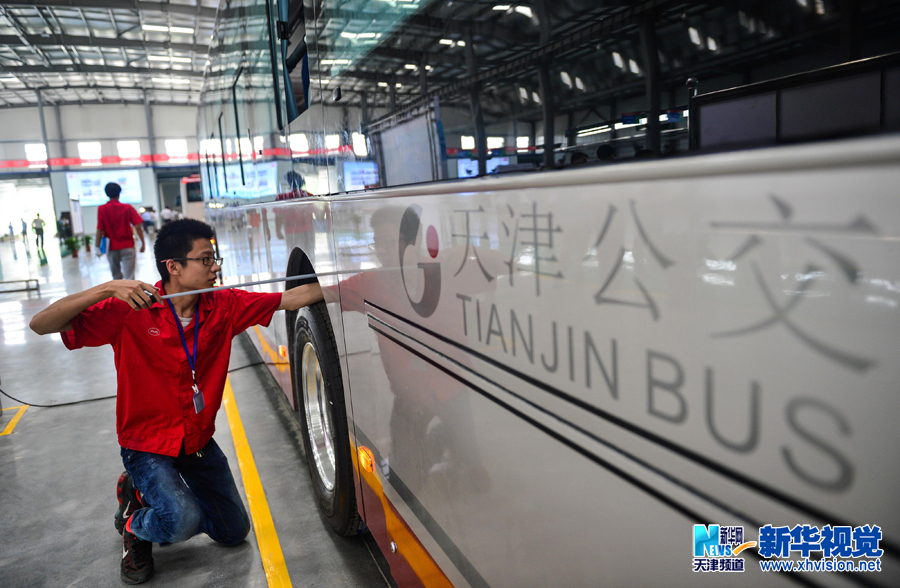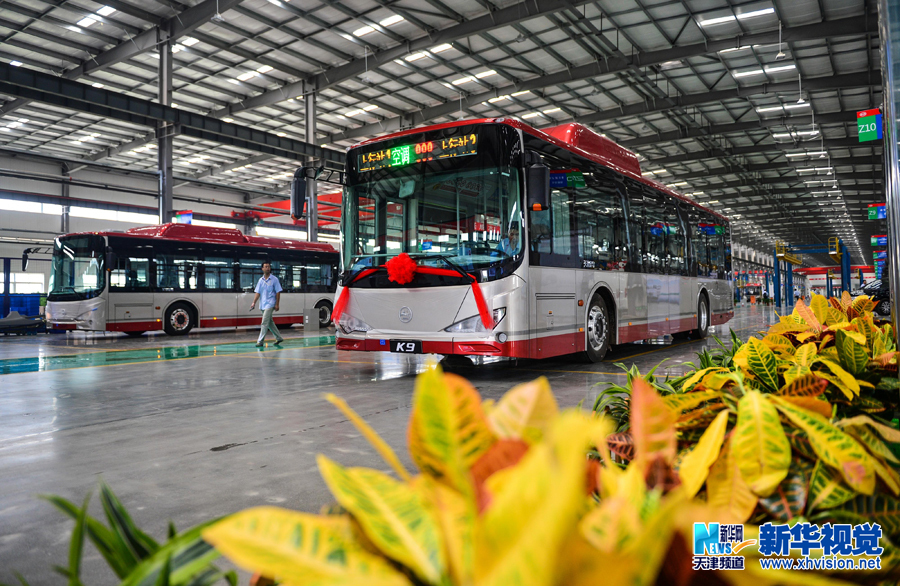 7月31日,位于天津市武清区的天津比亚迪新能源客车基地正式竣工,并迎来首台"金马"牌纯电动公交车下线。该基地由天津市公交集团和比亚迪汽车工业有限公司合资合作建设,为华北地区首个新能源大型客车生产基地。目前一期建设的联合厂房,预计年产3000辆新能源汽车,包括k9a和k9h两款纯电动大客车。(游思行 摄)
