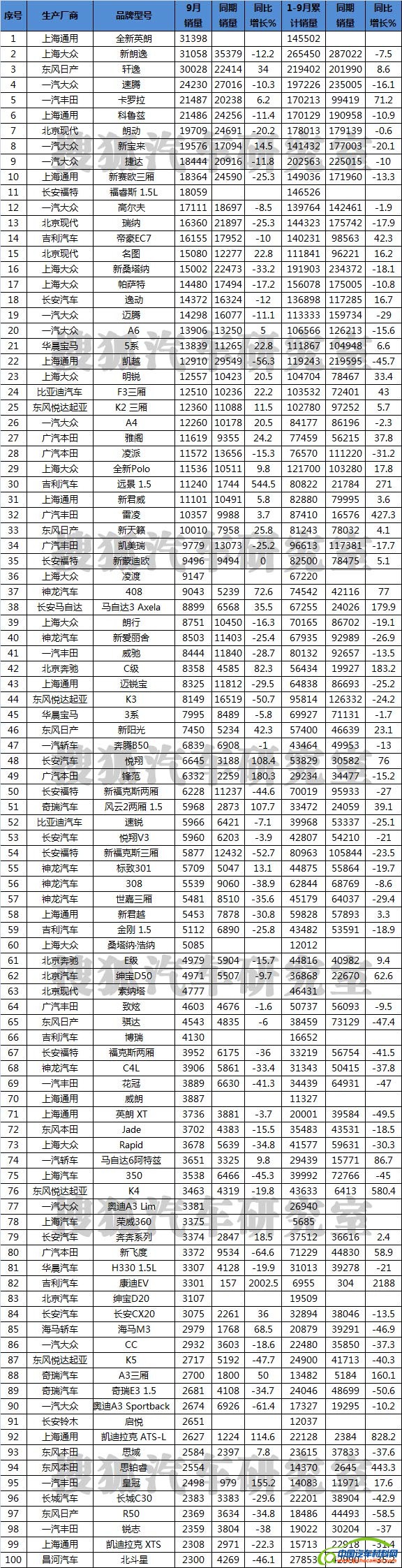 10月13日,全国乘用车市场信息联席会(简称乘联会)发布最新销量数据。9月,从乘用车批发销量来看,轿车市场依然延续下滑趋势,同比下滑11%至959,495辆,1-9月累计销量8,254,990辆,同比下滑9.2%。