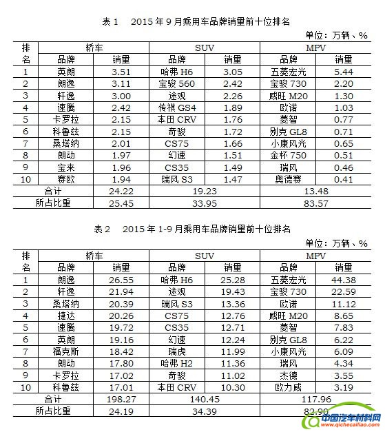 销售情况总体概述:9月,乘用车共销售175.12万辆,环比增长23.41%,同比增长3.26%。在乘用车细分品种中,与上月相比,交叉型乘用车销量增速略低,其他三大类品种增速均超过20%;与上年同期相比,运动型多用途乘用车(SUV)销量保持快速增长,其他品种呈不同程度下降。9月,基本型乘用车(轿车)销售95.16万辆,环比增长24.86%,同比下降10.80%;运动型多用途乘用车(SUV)销售56.65万辆,环比增长25.01%,同比增长58.79%;多功能乘用车(MPV)销售16.13万辆,环比增长21.56%,同比下降4.09%;交叉型乘用车销售7.18万辆,环比增长1.05%,同比下降31.15%。