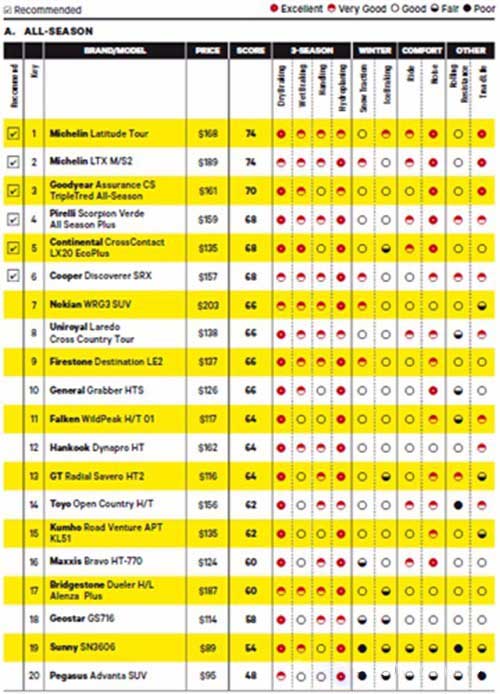 去年底,美国消费者报告公布了一份关于轮胎的测试排名,共有45种SUV和皮卡轮胎参加测试,其中四季胎20种。测试项目共有10项,包括干地测试、湿地测试及滚动阻力台架测试。