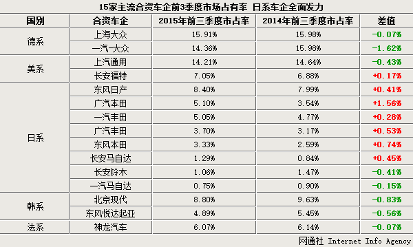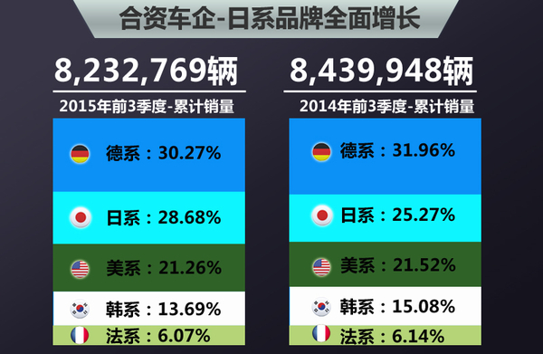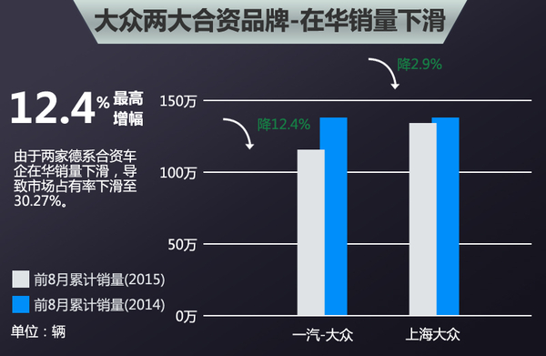 2015年前三季度中国车市整体销量出现下行,同比下滑8.1%。受此影响,国内众多合资品牌销量出现大幅下滑,并导致市场占有率也所缩减,涉及德系合资车企一汽-大众、上海大众以及美系上汽通用等。