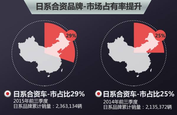 虽然今年前3季度中国汽车市场处于销量下滑的大环境下,但是日系品牌却呈现整体上涨的态势。网通社通过梳理国内15家主流合资车企发布的前三季度业绩报告后发现: 8个主流日系合资品牌的前三季度累计销量达到2,363,134辆,同比提升10.7%,市场占有率也从去年的25.27%提升3.41个百分点至28.68%。