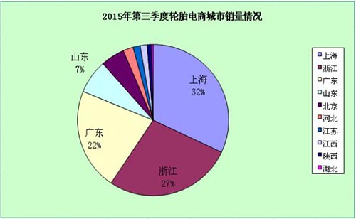 2015年第三季度,轮胎电商地域格局继续趋向多样化,电商领域“霸主”上海轮胎电商销量相比上半年有所下降,仅占32%,浙江、广东轮胎线上销量奋力直 追,直逼上海,分别占据27%和22%。其他省市如江苏、江西等地电商也发展迅猛,试图在轮胎电商市场“分多一杯羹”,由此可见,未来,轮胎电商的的区域 竞争势必更加激烈。