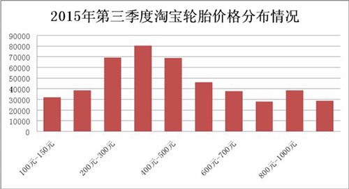 2015年第三季度,线上轮胎的销售价格基本维持不变,从150元到1500元不等,而200-500元的轮胎价格区间依旧最受消费者欢迎,相较于以往各 月份变化不大。三季度,300-400元的轮胎成交量已突破80000条大关。由此看出,平民化的价格仍然最受消费者欢迎。