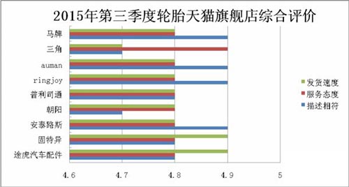 据统计,目前,进驻天猫旗舰店的轮胎品牌增至13家。从现有数据来看,无论是产品描述相符程度,还是商家发货速度和服务态度,各家轮胎品牌旗舰店的分数均 维持在中等水平。此外,从消费者的打分和评价方面可以看出,目前,商家的描述相符和服务态度的满意度普遍较低,商家仍需在这两方面多下功夫。