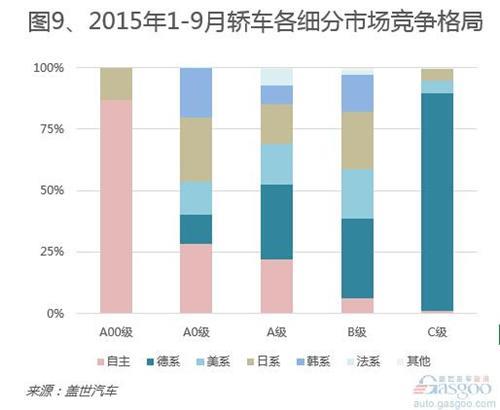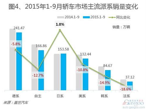 在轿车整体下跌形势下,日系品牌轿车前三季度销售同比增长1.0%,与自主品牌差距日益渐小,这主要得益于卡罗拉、雷凌等新车销量带动。销售量最高的德系品牌,前三季度在轿车市场销量同比下跌5.8%,在下降派系中跌幅最低,其市场份额占据三成。
