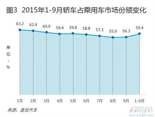 从轿车占乘用车市场的份额来看,今年前三季度轿车销售占比已跌破六成,为59.4%,同比下降9.1个百分点。前9个月份轿车份额也呈现持续下降态势,其中9月份降至当前最低点(56.3%)。而在巅峰时期2010年,轿车份额高达85%。