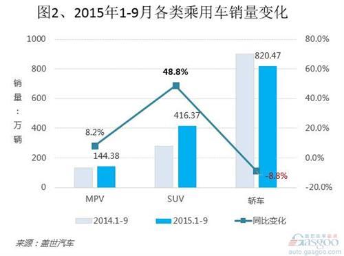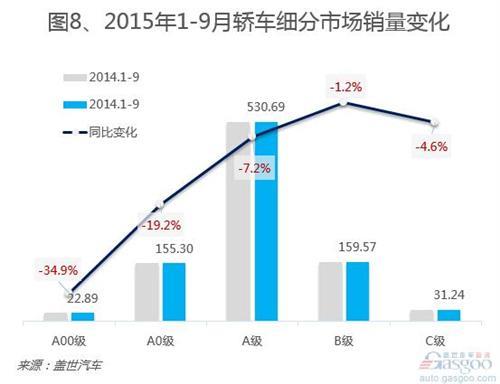 受分流作用影响,轿车市场今年遭遇滑铁卢,销量持续下跌。前9个月,除首月以外,轿车市场销量均不及去年同期,并且跌幅整体呈现扩大趋势,轿车市场6月份起销量均以两位数幅度下滑。1-9月,轿车市场累计销售820.47万辆,同比下滑8.8%。